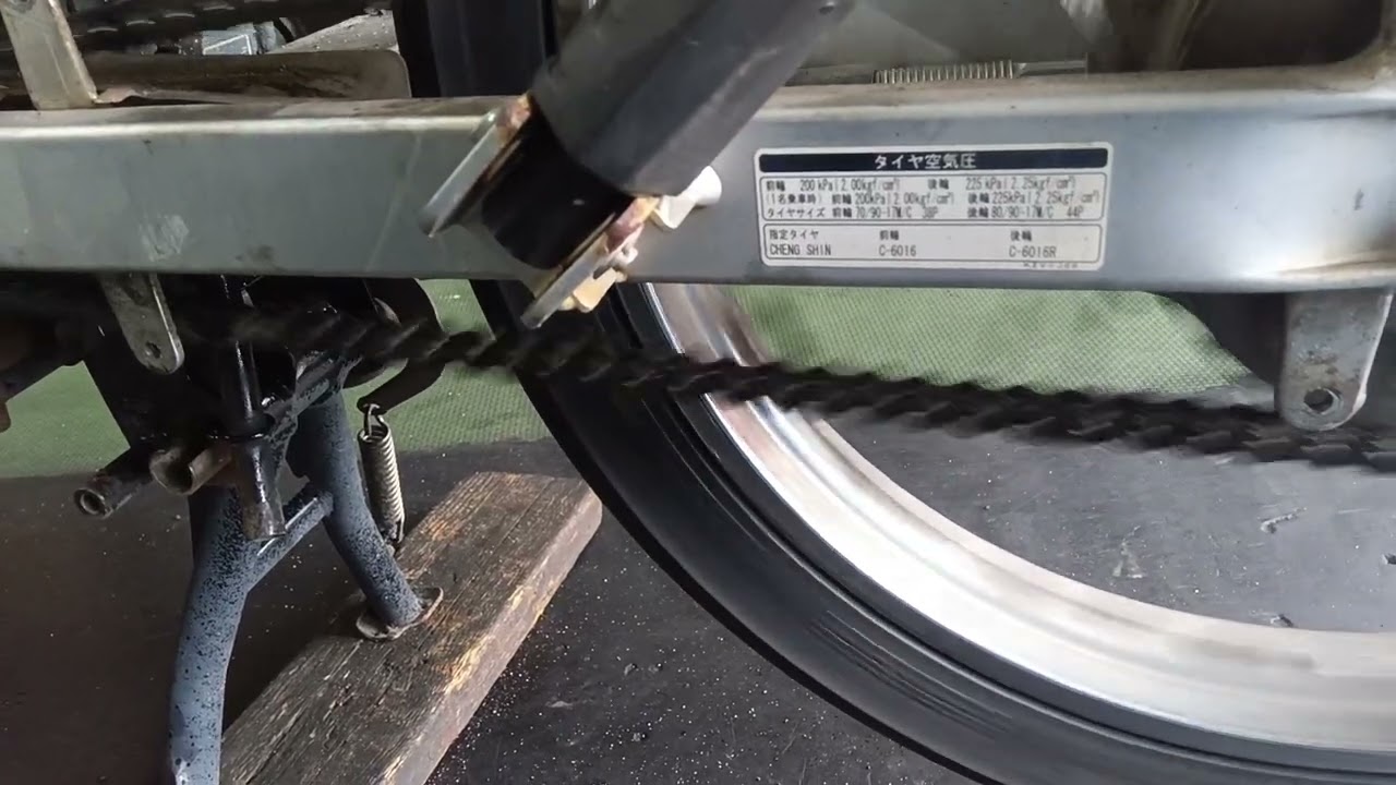 リヤホイールを、回転させるとチェーンがピンと張り気味のところと、弛みの大きいところがあります。これでは、張り気味のところで適正に調整しても弛みの大きいところではチェーンケースに干渉してしまい音がなってしまいます。